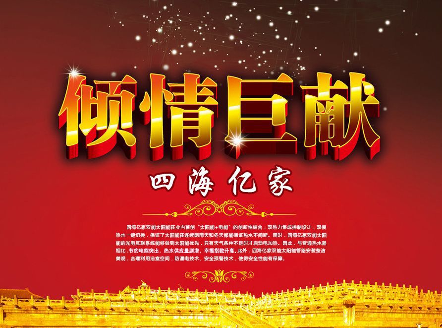 2015年,以智慧創造生活為理念的四海億家太陽能熱水器,在山東省菏澤市安裝了大批壁掛式太陽能熱水器工程。四海億家情親推出的壁掛式太陽能熱水器,雙能技術利用,實現了“多能源優化組合”,為消費者帶來全新的家庭熱水體驗。